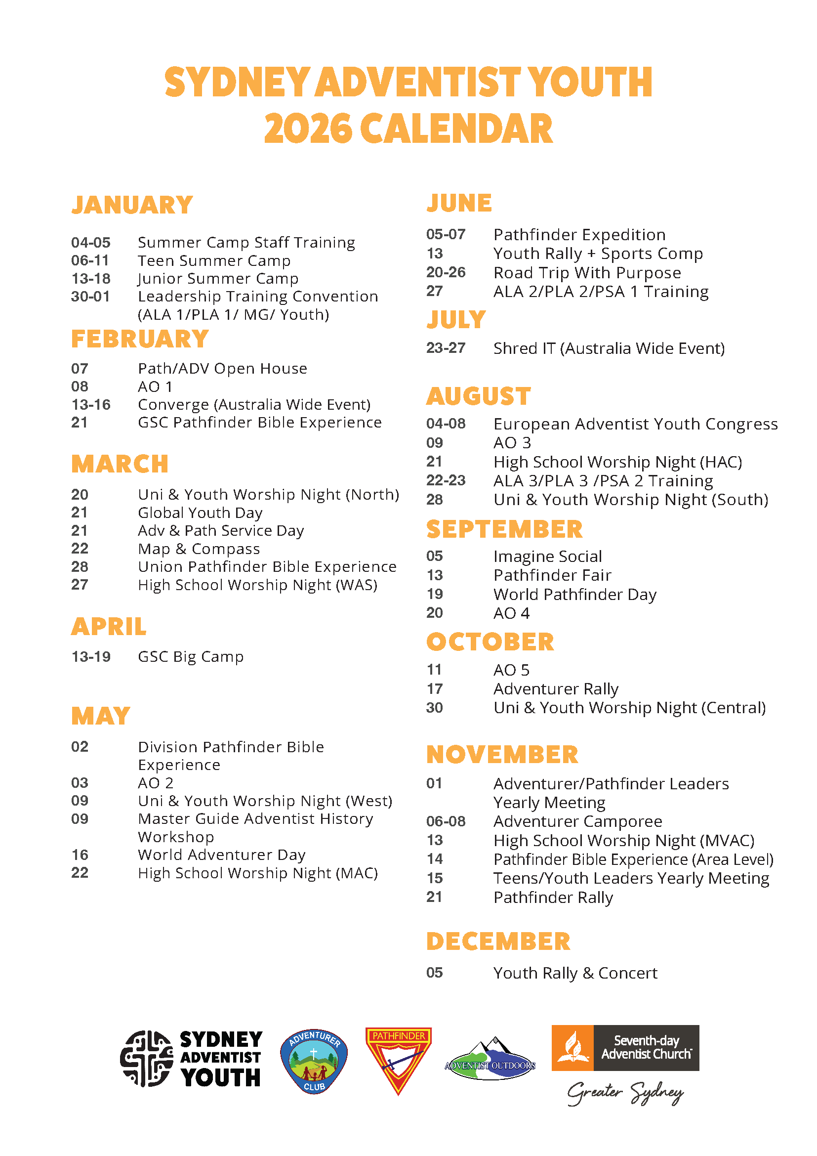 This Calendar includes Young Adult events, Teen events, and Pathfinder, and Adventurer events.